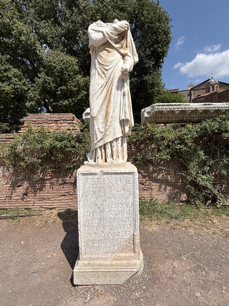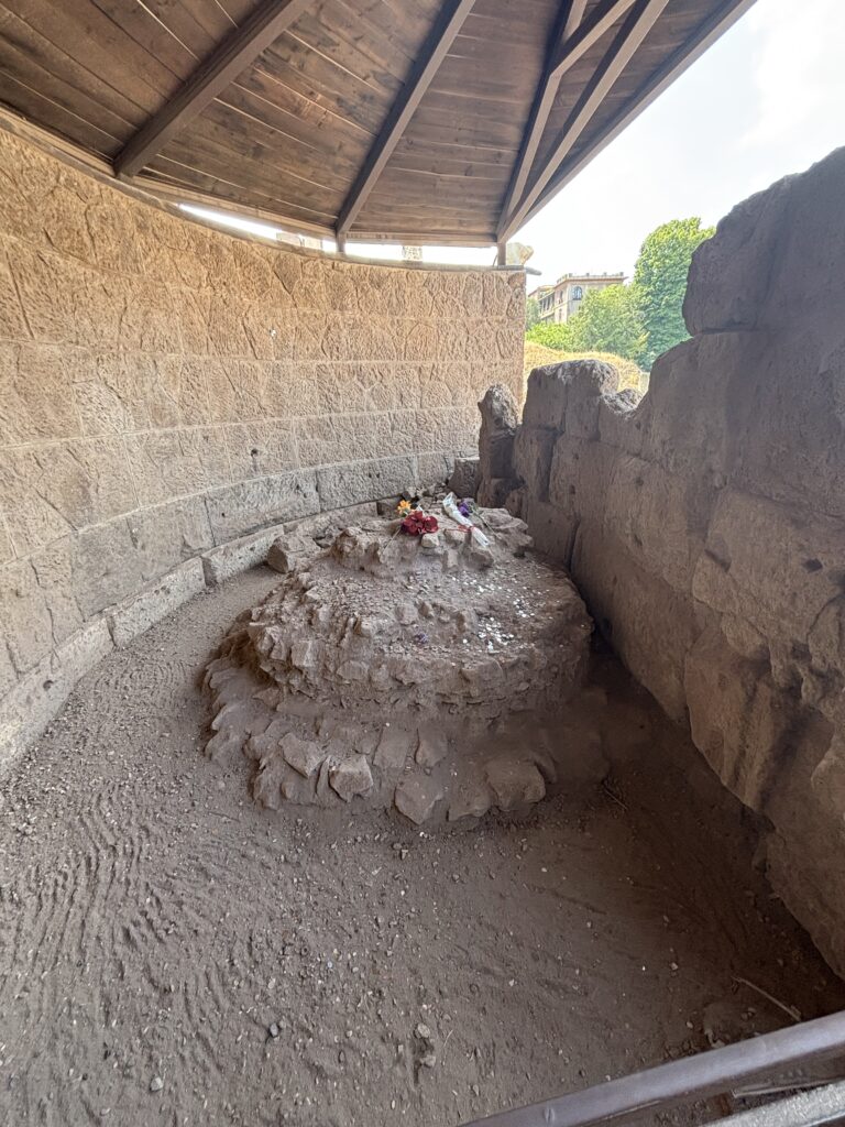 写真中央の円形の基壇は、カエサルの火葬が行われた場所とされ、今も花が手向けられています。