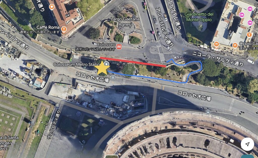 下の地図で ⭐️ が「Colosseo駅」。出口を出たら左に少し歩き、青いラインの階段を上がってください。赤いラインのあたりが、ちょうどコロッセオを正面から撮影できるおすすめスポットです。