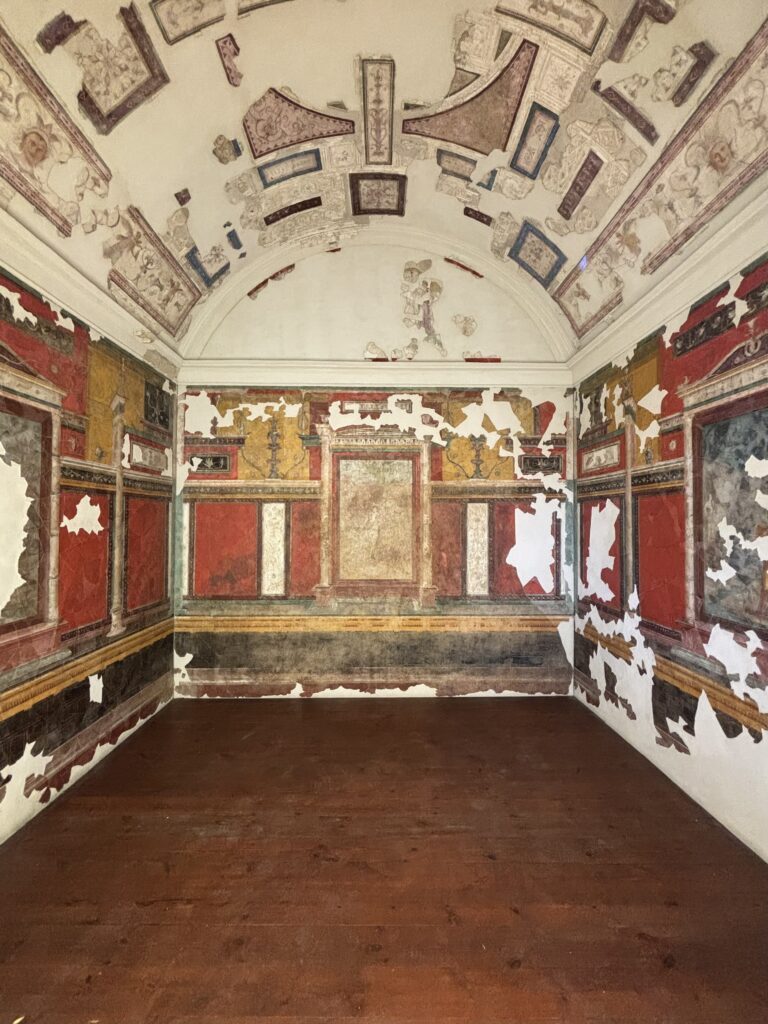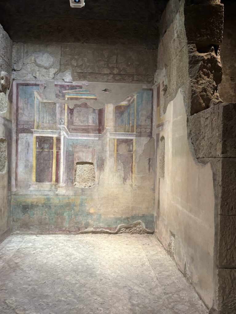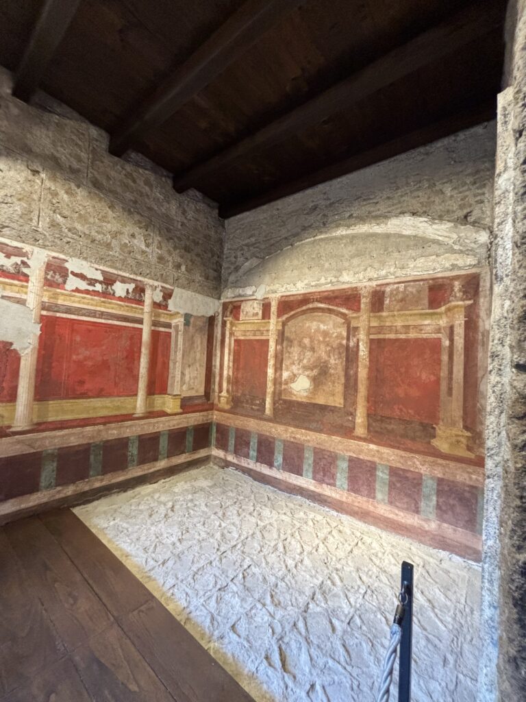 まず目を引くのが、美しい壁画が残る部屋。建築的なだまし絵のような装飾が施され、2000年前(コロッセオよりもさらに100年前)とは思えないほど色彩が鮮やかに残っています。