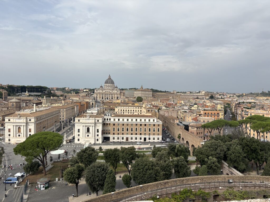 サンタンジェロ城から望むバチカン方面。中央に見えるのがサン・ピエトロ大聖堂で、その手前に法王の避難通路パッセット・ディ・ボルゴ(城からバチカンに向かってまっすぐ伸びている煉瓦色の細長い壁状の構造物)