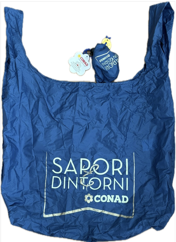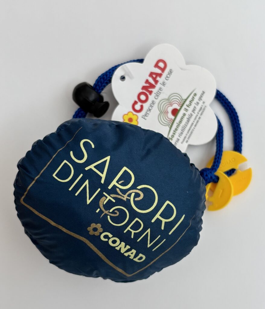 ローマのスーパー「Conad(コナド)」のエコバッグは、ころんとした形がとても可愛いデザイン。