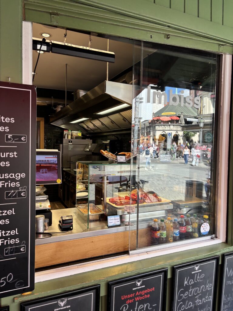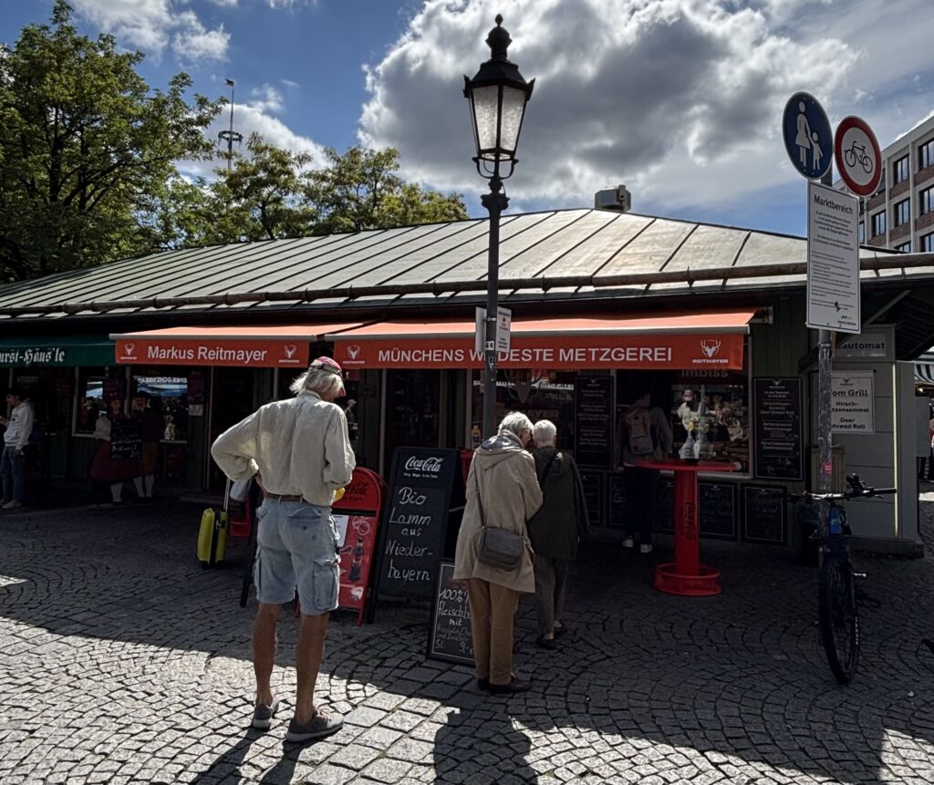 赤い屋根と「MÜNCHENS WUIDESTE METZGEREI(ミュンヘンで一番ワイルドな肉屋)」という看板はとても印象的です。次から次へと地元のお客さんが来ていました。