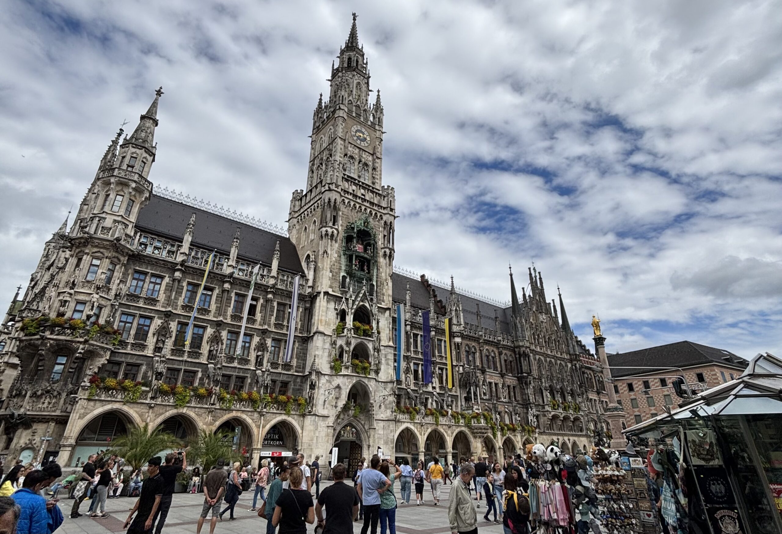 歴史ある建物に囲まれた広場はいつも人で賑わっていて、まさに街の中心という雰囲気です。東側には中世の趣が残る旧市庁舎、西側には壮麗なゴシック様式の新市庁舎がそびえています。