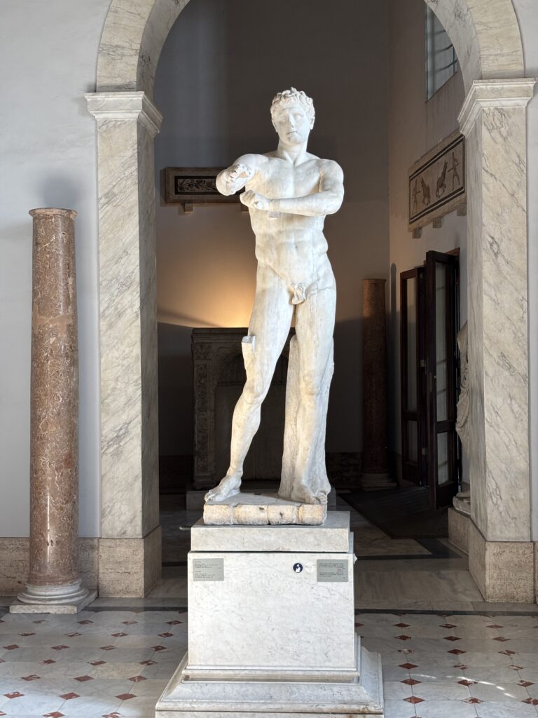 弓を放った直後の姿を表した古代の大理石像。均整のとれた姿は長く“最も美しい男性像”と称えられ、実際に見ると気品ある存在感がありました。