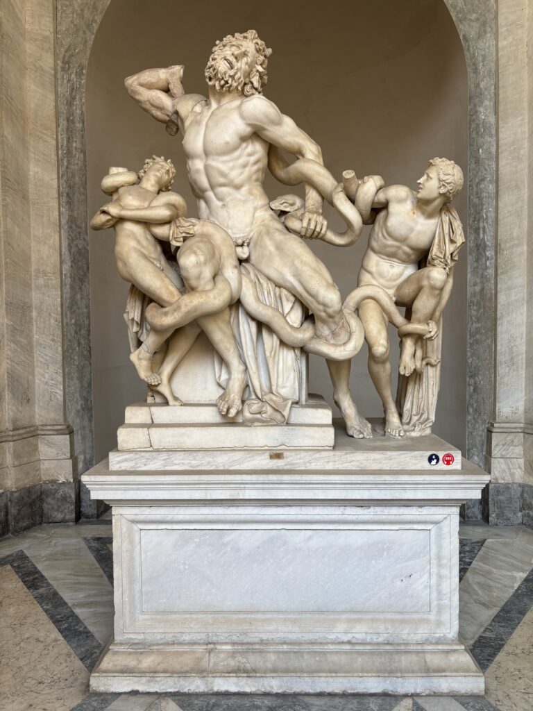 ヘレニズム期を代表する群像彫刻で、苦しむ表情や体のねじれまで驚くほどリアル。ギリシャ神話の悲劇で、トロイの木馬を巡り神々の怒りを買ったラオコーンが息子たちと共に大蛇に襲われる場面を表しています。石でできているとは思えないほどの躍動感がありました。
