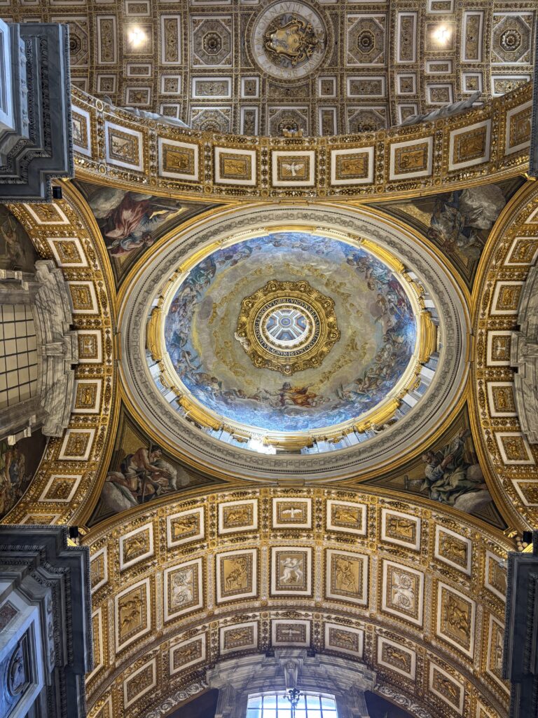 サン・ピエトロ大聖堂のクーポラ(ドーム)はミケランジェロ設計によるもの。堂内から見上げると、高くとても美しい装飾が広がっていました。