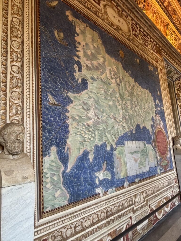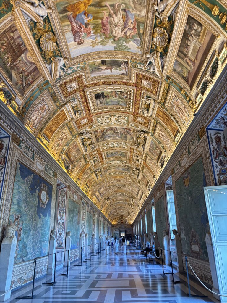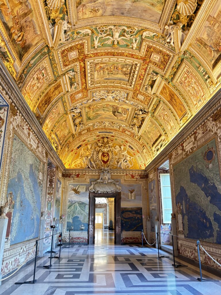 全長約120mの長い回廊に、16世紀に描かれたイタリア各地の地図が並んでいます。金色に輝く天井装飾はまるで美術品そのもので、歩いているだけで壮大な雰囲気に包まれました。
