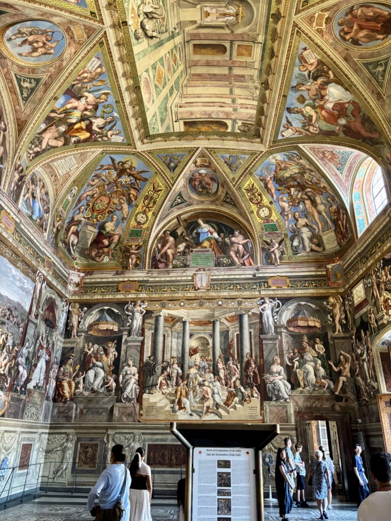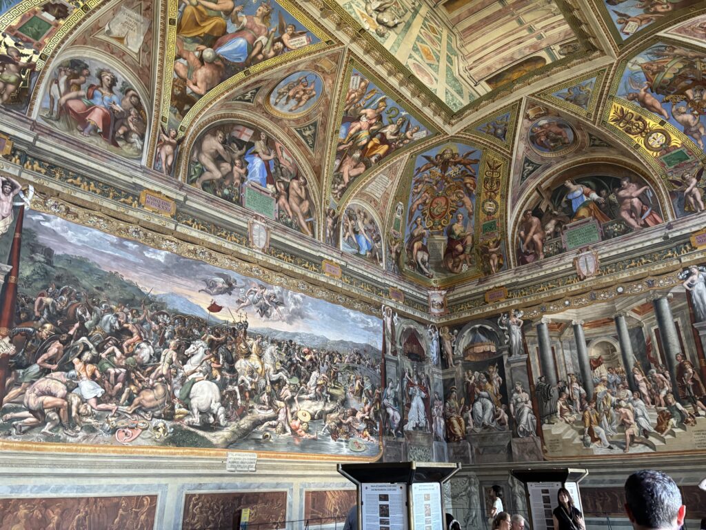 ローマ皇帝コンスタンティヌスの生涯を描いた大広間。左中央の「ミルウィウス橋の戦い」は、キリスト教公認につながる歴史的瞬間を描いています。壁いっぱいに描かれた戦闘シーンは迫力がありました。