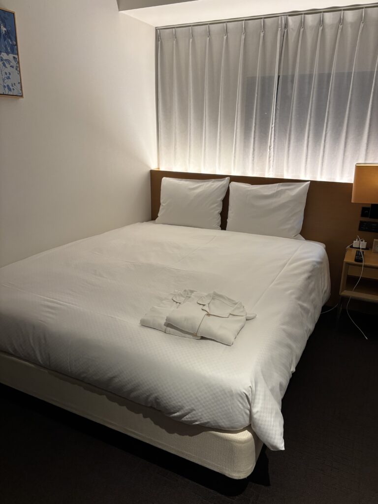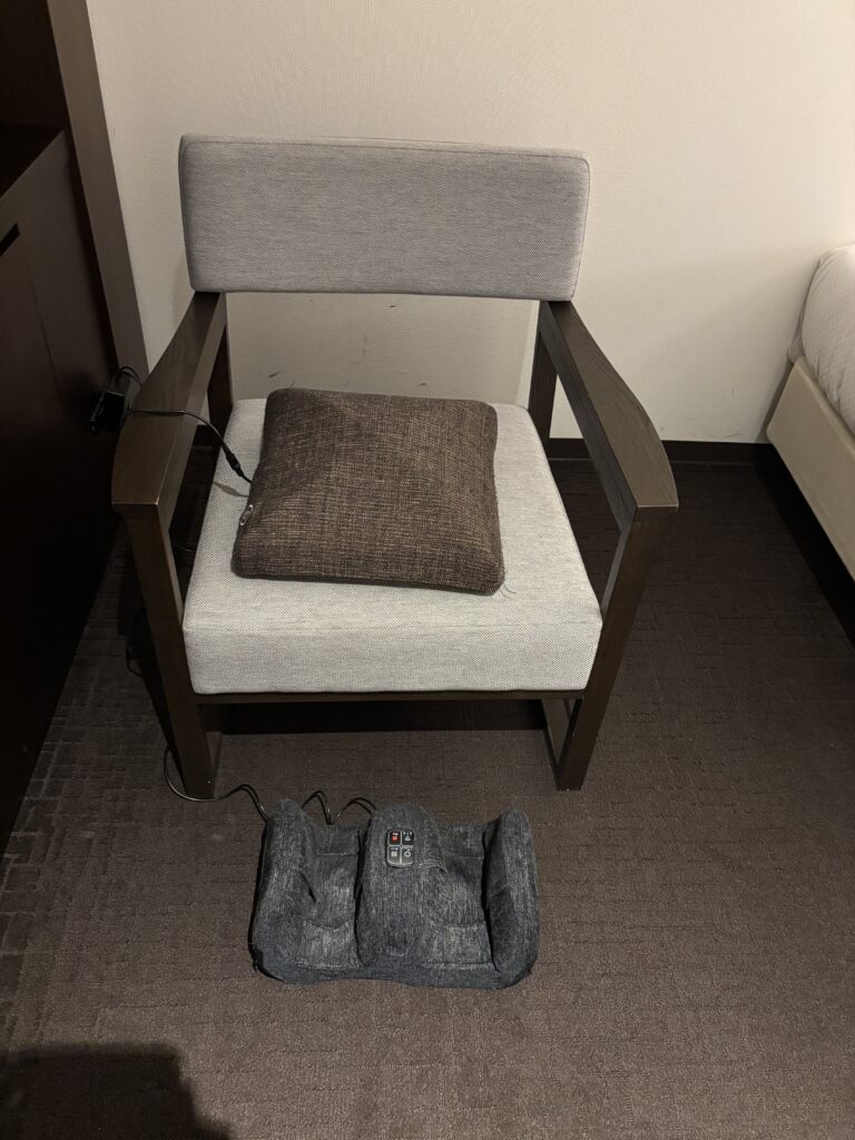 娘との2人旅でほぼホテルにいないというのもあり、お部屋はダブルルームリフレッシュ。(ベッド幅160cm) 部屋の中には足のマッサージ器と簡単なクッションマッサージもあります。これが歩き回った足に心地よくて。荷物を広げられるスペースもあり、思ったより広く快適に利用できました。